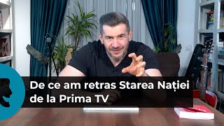 - Jurnalistul ploieștean Dragoș Pătraru a anunțat, într-un mesaj video încărcat pe canalul de YouTube Starea Nației, că emisiunea a fost retrasă de la Prima TV.